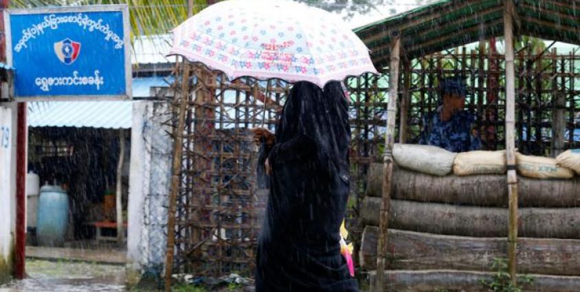 Rohingya woman and her child walk pass the police outpost at the Shwe Zar village in Maungdaw township, Rakhine State, western Myanmar. Photo: Nyein Chan Naing/EPA