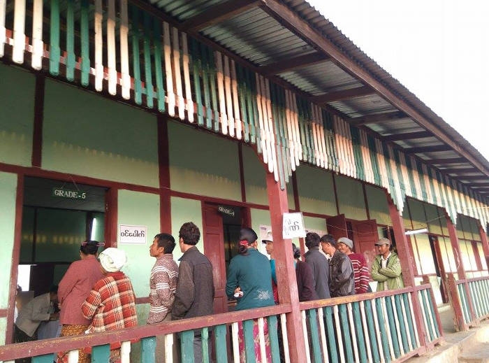 People stands in line at the polling station in Pyun Thone Lone Village of Kachin Sate's Mogaung Township to cast their votes on the Election Day