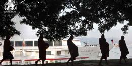 A group of students are walking on a hill under the fog of morning. They are on their way to school, which is located in the Ban Don Yan Refugee Camp...