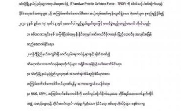 The TPDF, the first of its kind in Arakan State, composed of all political forces opposed to the military council. The People’s Defense Force (TPDF...