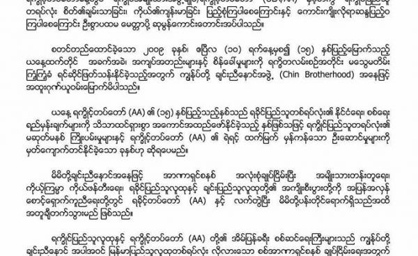 The Chin Brotherhood Alliance has announced that it will work with the Arakan Army (AA) to develop and protect mutual interests between the Rakhine...