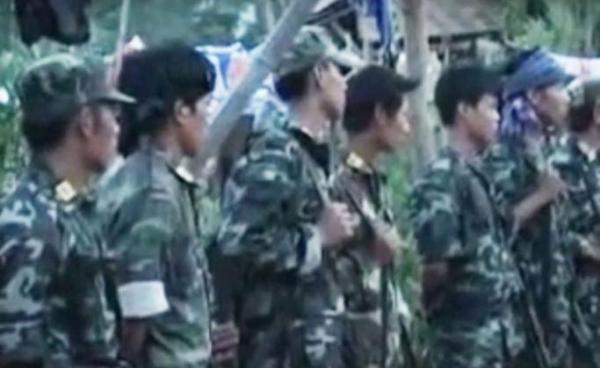 Armed rebels belonging to the Kachin Independence Army (KIA) ethnic group take a cigarette break as they move towards the frontline near Laiza in...