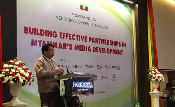 Myanmar's Minister of Information Minister Pe Myint speaks during the Myanmar's 7th conference on Media Development in Nay Pyi Taw on 05 December...