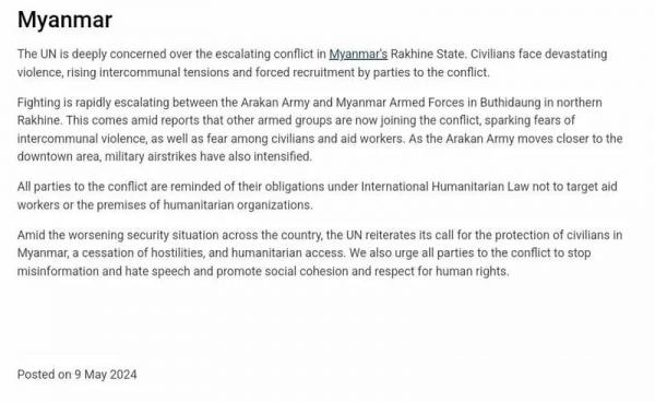 The United Nations expressed serious concern over the escalating conflict in Rakhine State of western Myanmar. In a statement released on 9 May, the...