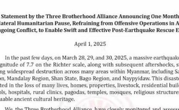 The three brotherhood groups (AA/MNDAA/TNLA) declared a one-month unilateral ceasefire today, April 1, to facilitate relief efforts following the...