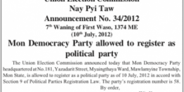 Today, state-run newspapers yesterday reported that the Mon Democratic Party (MDP) was officially registered.