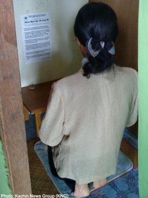 A woman prayed in the special room in Shatapru Kachin Baptist Church in Myitkyina, northern Burma.The non-stop 24-hour prayer service is taking place in every church belonging to the Zonal Church and hundreds of people in each church are praying after fasting, one at a time till tomorrow 6 a.m., those in Shatapru Kachin Baptist Church in Myitkyina told Kachin News Group today.