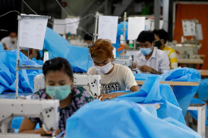 Workers make disposable surgical gown at a garment factory in Yangon, Myanmar, 02 May 2020.