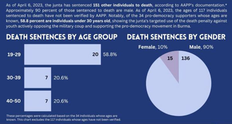 Myanmar’s military regime has sentenced 151 civilians to death during the two-plus years since the coup in February 2021, according to an April 11 press release from the Assistance Association for Political Prisoners (AAPP), which has been tracking casualties and detentions since the putsch.