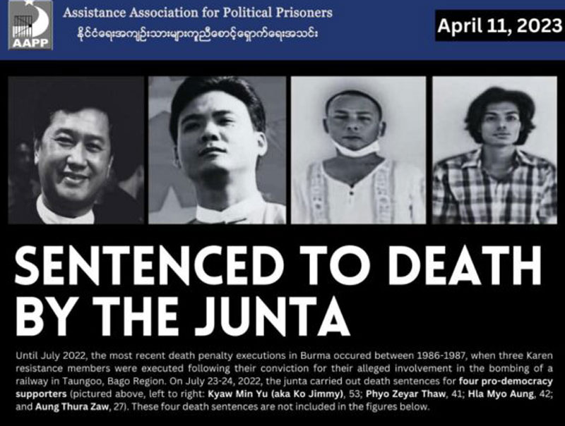 The regime sentenced to death four democracy activists — including 88 Generation student leader U Kyaw Min Yu aka Ko Jimmy and ousted National League for Democracy (NLD) lawmaker Ko Phyo Zeyar Thaw — in July 2022.