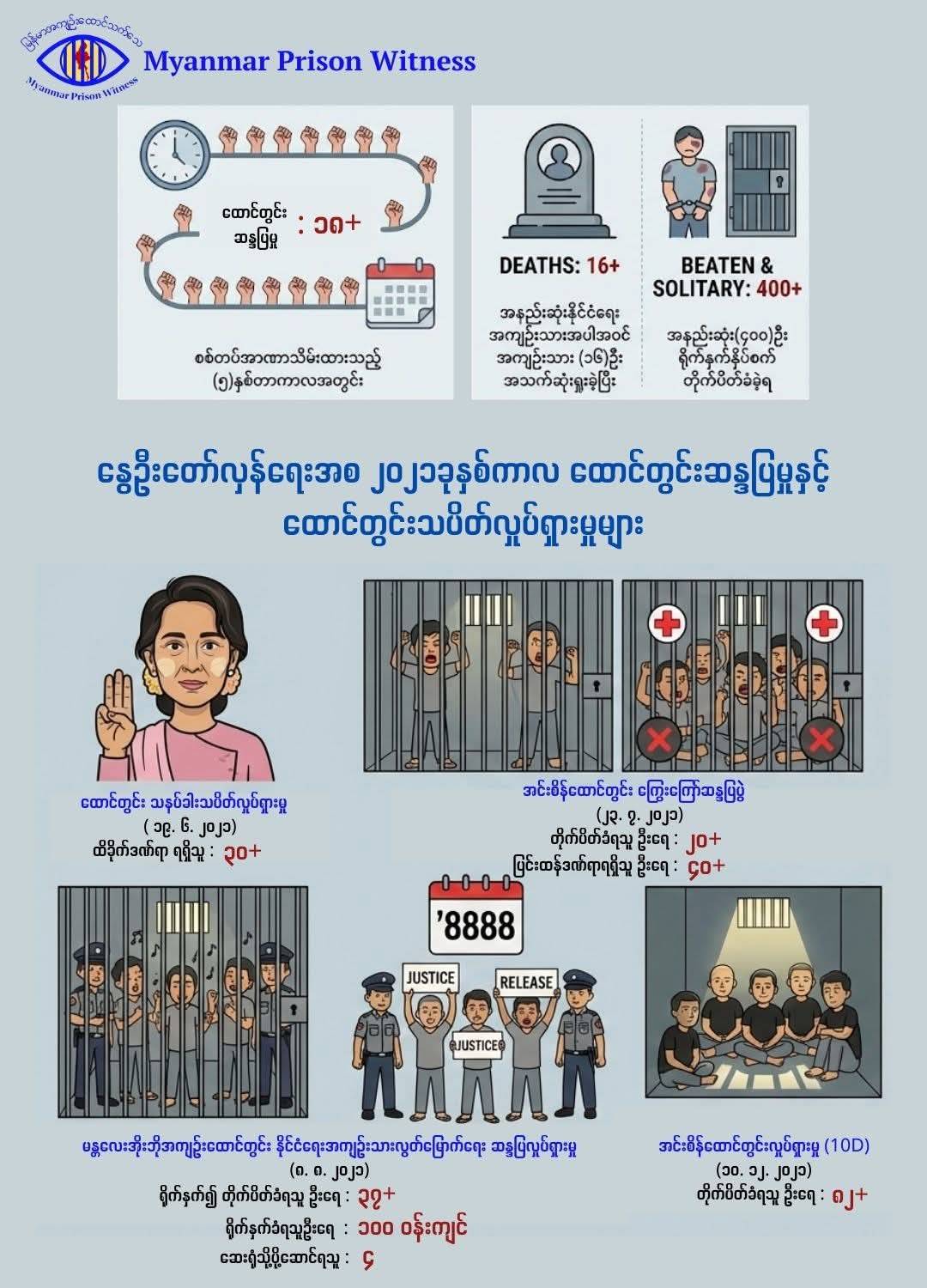 In the five years since the coup, at least 18 major inmate protests have occurred in junta-controlled prisons, with at least 16 inmates including political prisoners have died in custody and more than 400 forcibly placed in solitary confinement, according to Myanmar Prison Witness (MPW).