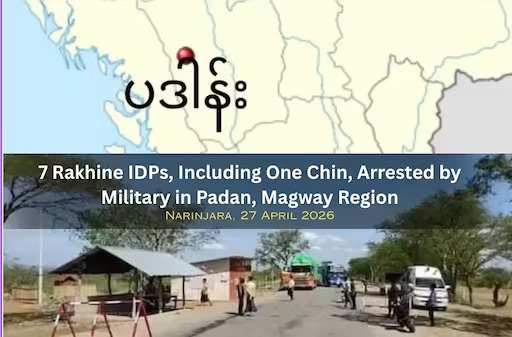 Khaing Lu Hla (Roma Mray)— Seven internally displaced people (IDP) from Rakhine State, including one Chin national, have been arrested in Padan, a town near the ongoing fighting around the Nattwan Taung outpost in Ngaphe Township, Magway Region.