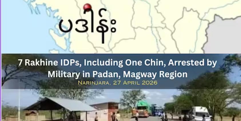 The individuals are internally displaced persons from Ann Township who were fleeing to Padan to escape intensified fighting in Rakhine. According to a local source, the Chin national was arrested on April 23, while six Rakhine nationals were arrested on April 24.