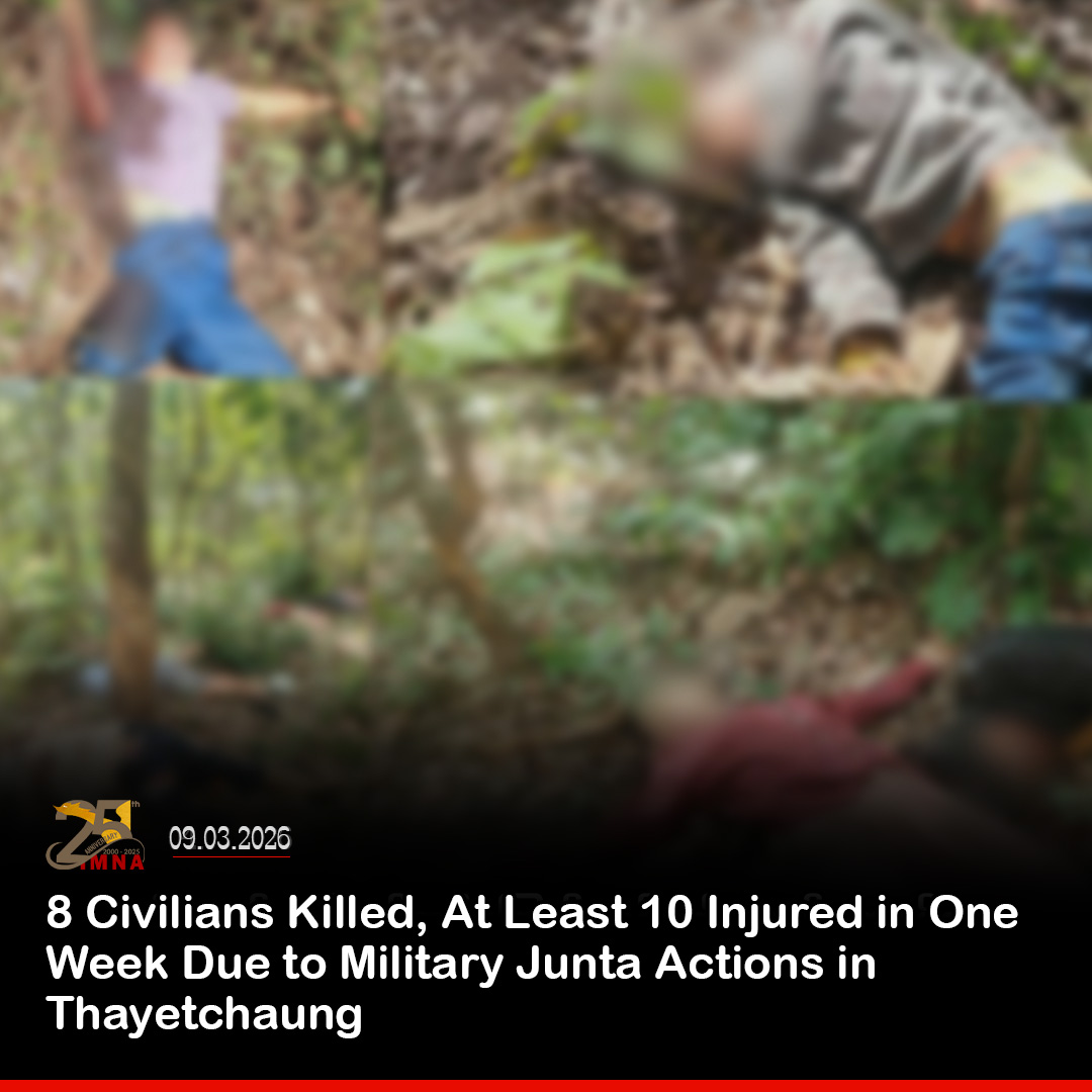 At least eight civilians were killed and more than ten others were injured within a week due to actions by Myanmar’s military junta in Thayetchaung Township, located in Myeik–Dawei District of Tanintharyi Region, according to a statement released by the Karen National Union (KNU).