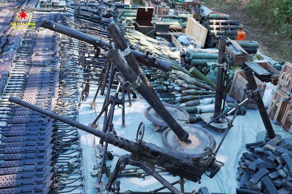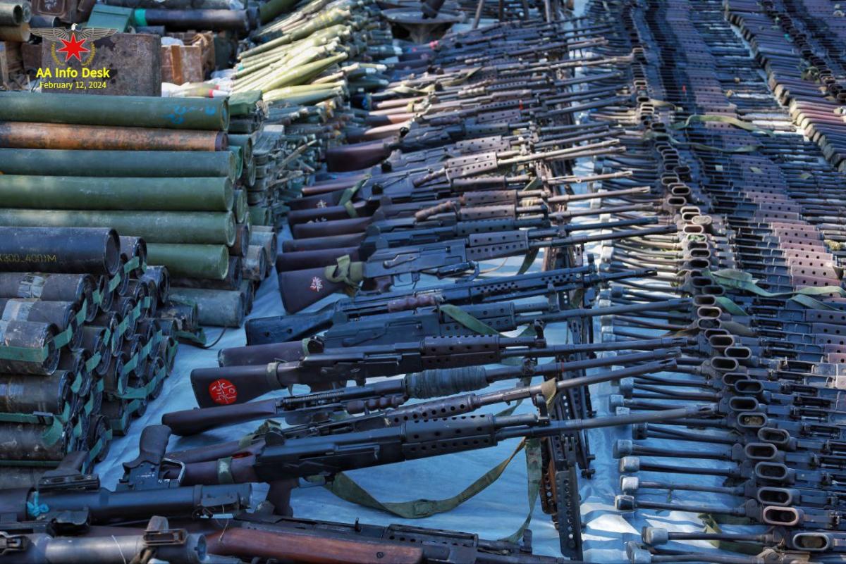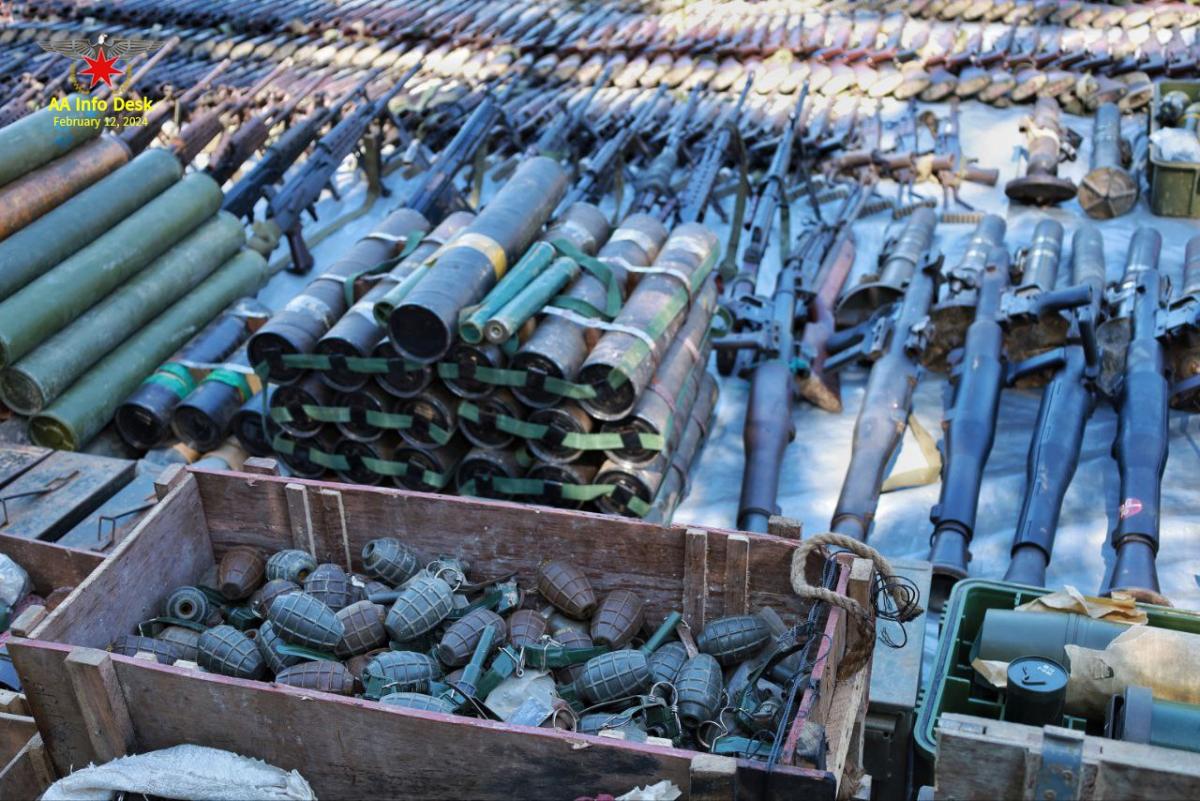 After successfully capturing the camps of 540th, 377th, and 378th Light Infantry Battalions along with the 31st Police Battalion, all stationed in Mrauk-U, AA showcased the weapons and ammunition confiscated from the 377th and 378th Light Infantry Battalions.