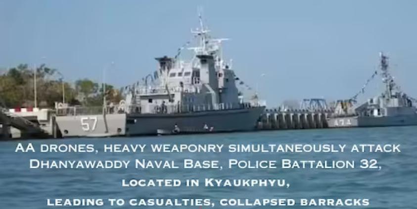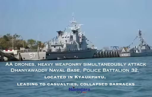 Reports indicate that the Arakan Army (AA) implemented synchronized assaults on the Dhanyawaddy Navy base, which is the largest naval installation located along the Rakhine coast, and Police Battalion 32, the main defense base for the junta on the ground, employing drones and heavy artillery.