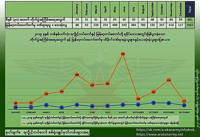 The AA said 3,562 Tatmadaw soldiers were killed or injured in 2019, giving a similar month-by-month accounting of those casualties: 88 in January; 92 in February; 220 in March; 254 in April; 490 in May; 343 in June; 364 in July; 783 in August; 150 in September; 247 in October; 414 in November; and 117 in December.