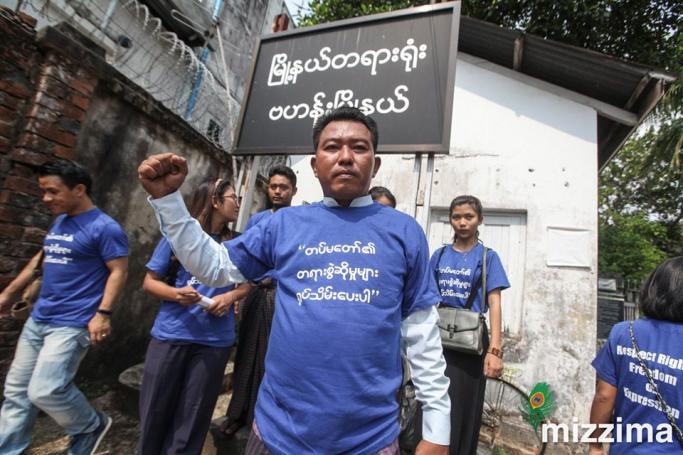 Demonstrators turned up at the hearing wearing blue t-shirts with slogans calling for the withdrawal of cases filed by the Tatmadaw. The group was protesting against actions in a different case concerning an alleged defamation incident during the recent Thingyan festival.