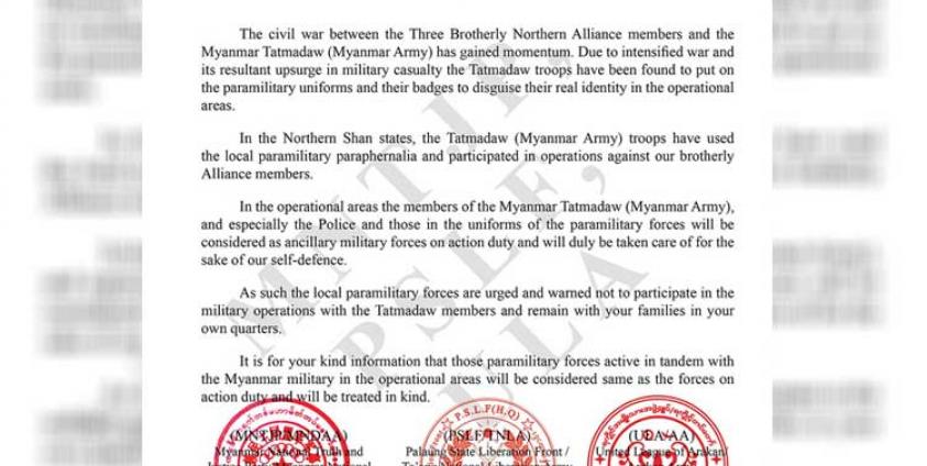 The three ethnic armed groups would attack Tatmadaw troops and police as well as those at the front lines wearing militia uniforms that support the forces of the Tatmadaw, it announced.