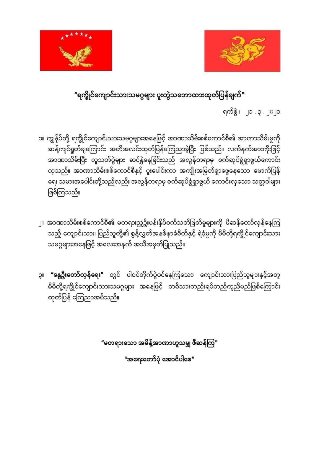 Eleven Arakan student unions and 77 Arakan CSOs issued a joint statement on March 21st declaring their opposition to the military dictatorship.