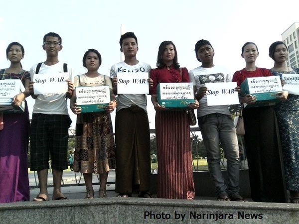 Over 10 students from the Arakan Students’ Union attended the protest. They held placards that said: ‘Stop War’, ‘All Ethnic People Need to Participate for Internal Peace’ and ‘Support Education of Child Refugees from War’.