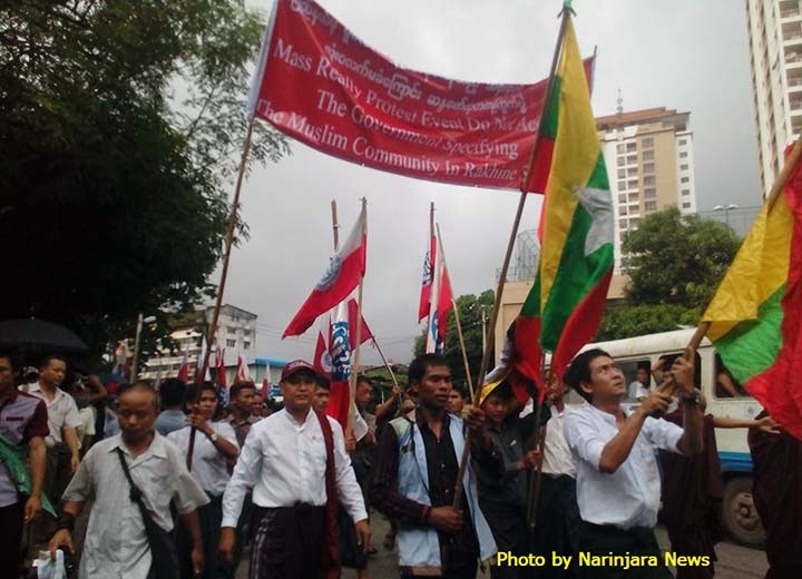 Three Burmese protesters, who led a demonstration against the use of Muslim community terminology (in Arakan State) in Yangon on 10 July were recently charged by the Bahan township police under the Procession Act 19.