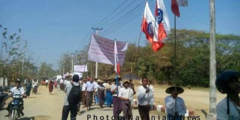 The protestors gathered at the Shittaung Temple around noon and marched around the town at 1pm while holding placards.