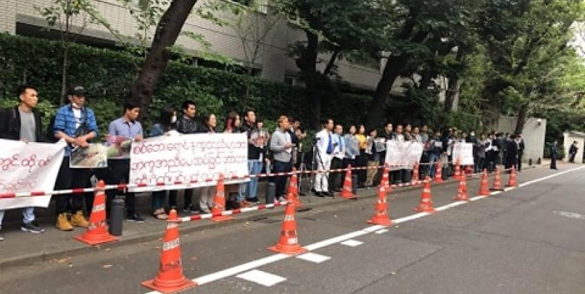 Around 100 Arakanese nationals in Japan staged a demonstration against the visiting State Counsellor Daw Aung San Suu Kyi in front of the Myanmar embassy on 21 October.