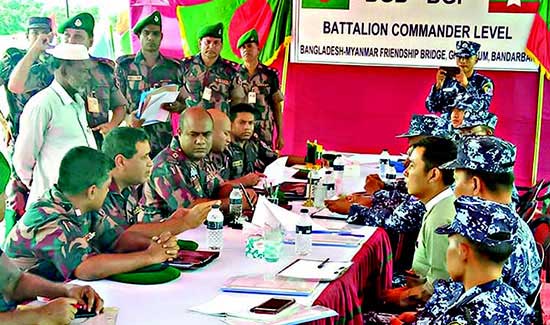 Lt Colonel Ali Haidar Azad Ahmed, commanding officer of the BGB 34 Battalion in Cox’s Bazar, led the talks from the Bangladesh side, while the Myanmar side was led by Lt Colonel Kyi Young, the BGP commanding officer in Maungdaw. Lt Colonel Faisal Hasan Khan, commanding officer of BGB 2 in Teknaf was also present at the meeting.