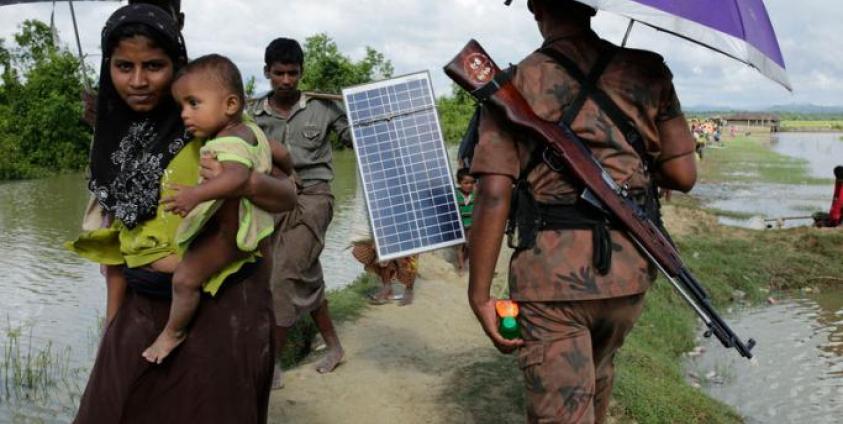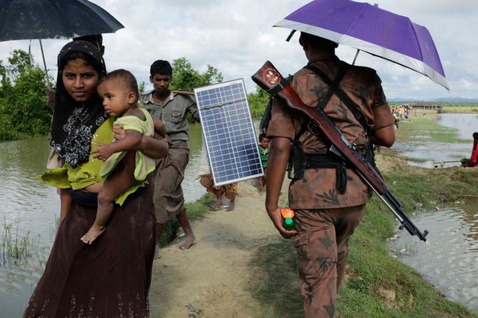Bangladesh Border Guard (BGB) between paddy field behind the border of Bangladesh after they fled from Budichong, Myanmar, and were crossing the Naf river, near Palongkhali, Bangladesh. Photo: EPA