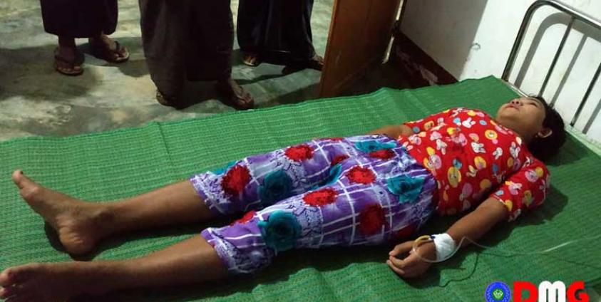 Ma Mya Thazin, a 14-year-old student, was hit by a piece of shrapnel in Zedi Taung village in Buthidaung Township, and is now receiving medical treatment at the Sittwe hospital on 3 October.
