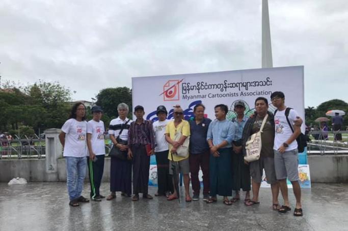 The cartoon exhibition in Yangon was held in front of Mahabandoola Square and the cartoonists sold T-shirts with their cartoons drawn on them as per the request made by the buyers.