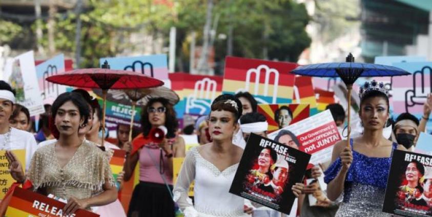 Photo: Members of the lesbian, gay, bisexual, transgender and queer (LGBTQ) community march during a protest against the military coup, in Yangon, Myanmar, 19 February 2021. Photo: EPA