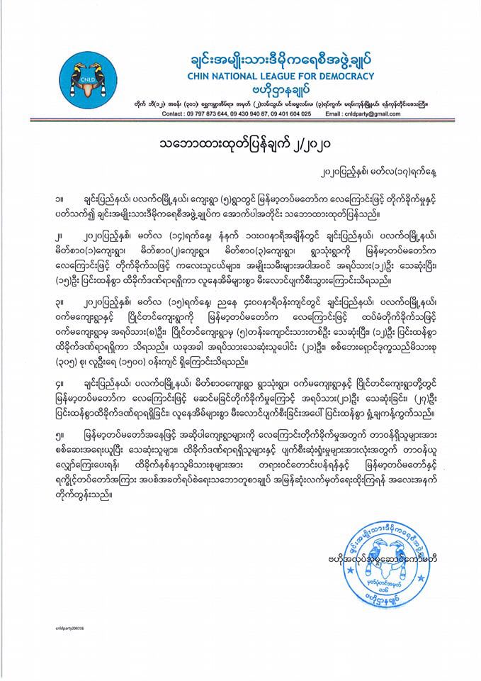 The Chin National League for Democracy (CNLD) issued a strong condemnation of the Burma Army’s recent air strikes on villages in Paletwa Township, Chin State, leading to mass displacement and more than 20 deaths.