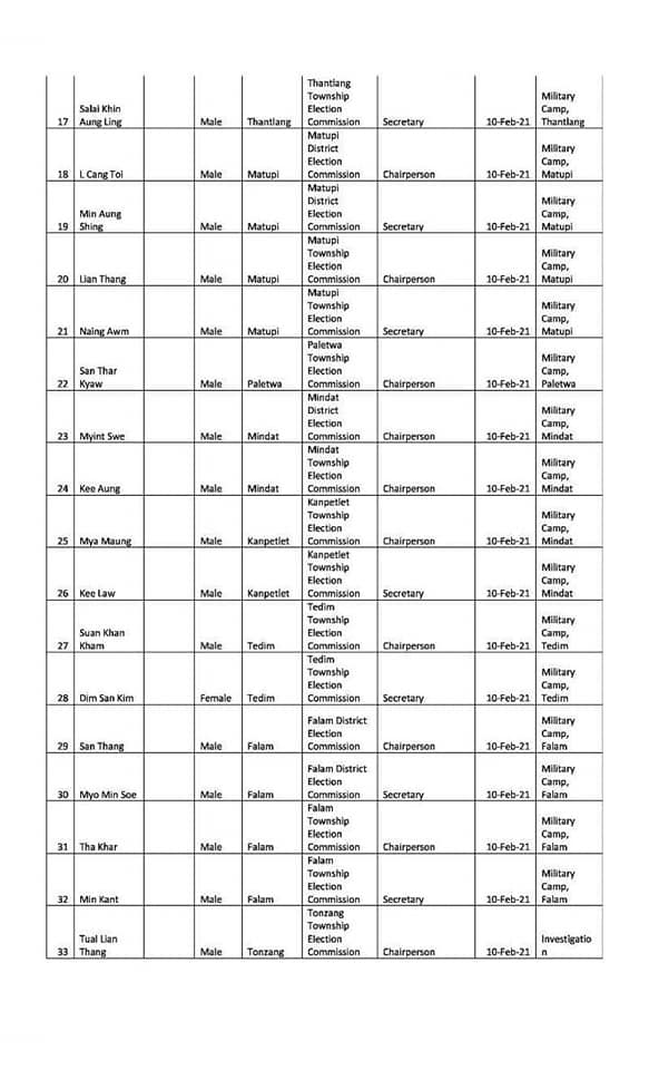 Most detainees in Chin State are officials of election sub-commission. Currently, the police have arrested a total of 25 chairs and secretaries of Township Election Sub-Commission including Chair of Chin State Election Sub-Commission and Secretary U Lin Kyaw, according to the Chin Human Rights Organization.