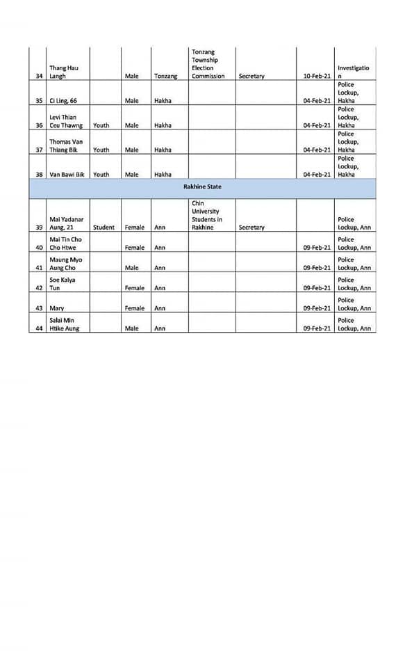 According to the statement by Chin Human Rights Organization, the total number of the detainees since the February 1 coup has reached 38 in Chin State. Six Chin ethnics are also arrested in Ann Township of Arakan State.