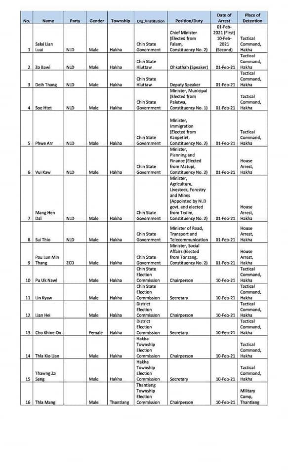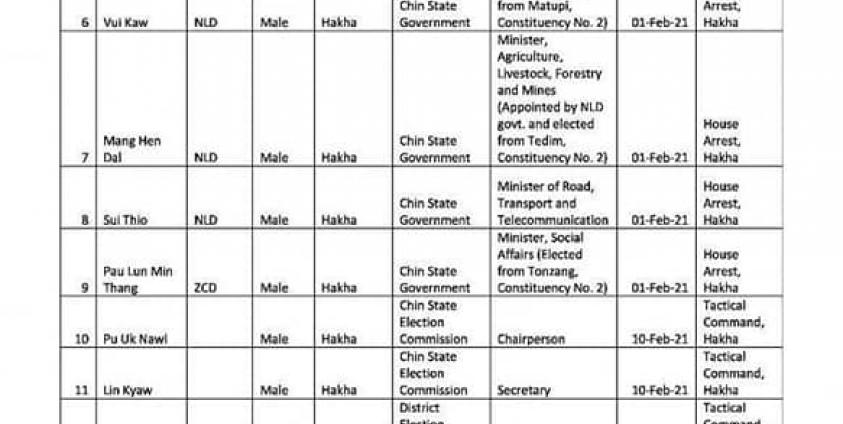 Chin State Chief Minister Salai Lian Luai, Development Affairs Minister U Soe Htet, Minister for Immigration and Human Resource Development U Chi Phwe, Chin State Parliament Speaker U Zo Bwe and Vice Parliament Speaker U Take Htan are all being detained at the military camp in Haka Township.