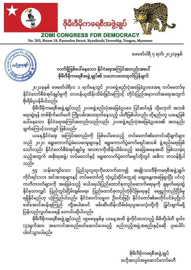 In its response to the military coup, The Zomi Congress for Democracy (ZCD) has declared “the ZCD is concerned for the country’s future since the Tatmadaw has seized power. The current political crisis is due to the flaws in the 2008 Constitution.”