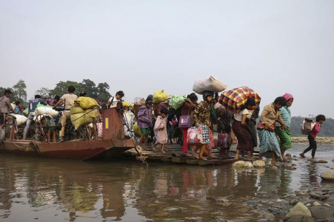 This picture taken on April 26, 2018 shows displaced Kachin residents crossing Malikha river on a ferry to escape the fighting in Injanyan village near Myitkyina between the Kachin Independence Army, ethnic armed group against the Myanmar government troops in Myanmar's northernmost state of Kachin near the border with China. Photo: Zau Ring Hpra/AFP