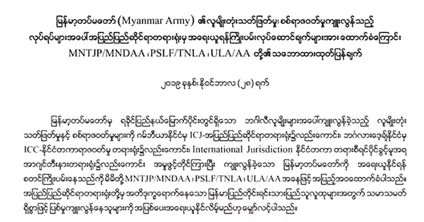 Two days earlier, on November 28, the AA, MNDAA, and TNLA released their own statement backing the prosecution of Burma at the ICJ for the crime of genocide against the Rohingya people of Rakhine State. Representatives of the armed groups have said that the Burmese military is guilty of similar war crimes throughout the country.
