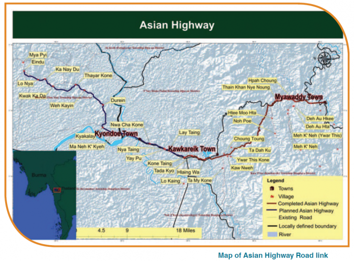 Additionally, the border crossing at Mae Sot-Myawaddy stands on Asian Highway 1, which connects east, southeast, south, and west Asia. While the Asian Highway portion of Myanmar was problematic due to ethnic insurgencies along the route, the situation has changed for the better with nationwide ceasefire agreement in place and especially with the control of the Karen BGF in the area.
