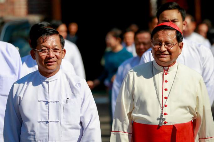 Commander-in-Chief of the Myanmar Armed Forces, General Min Aung Hlaing (L), walks next to Cardinal Charles Maung Bo (R) as he leaves after visiting St. Mary's Cathedral on Christmas Day in Yangon, Myanmar, 25 December 2019. Photo: Lynn Bo Bo/EPA