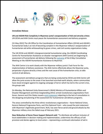 Burma Civil Society Organizations concerned at UN aid funds being weaponized by the military-appointed State Administration Council issued a statement calling for an end to the ASEAN Coordinating Centre for Humanitarian Assistance (ASEAN AHA Center) and the United Nations Office for Coordination of Humanitarian Affairs (UNOCHA) decision to conduct humanitarian assessments in collaboration with the Military Council.