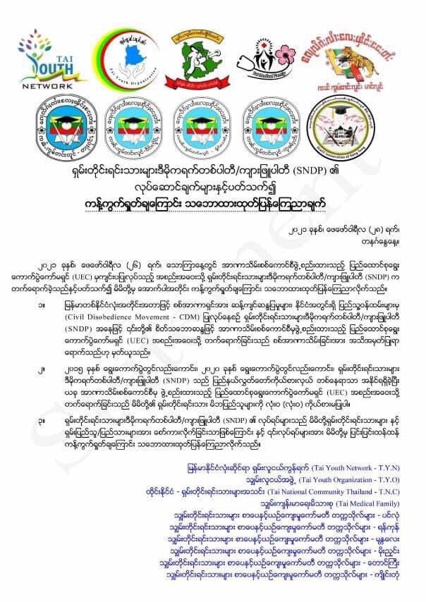 Shan organizations issued a joint statement on February 28th saying that “the SNDP’s decision to collaborate with the Union Election Commission (UEC) formed by the army’s State Administration Council is an insult to Shan ethnic people and the public, at a time when the people are staging the nationwide strikes against the military dictatorship and the civil servants are conducting the Civil Disobedience Movement (CDM).”