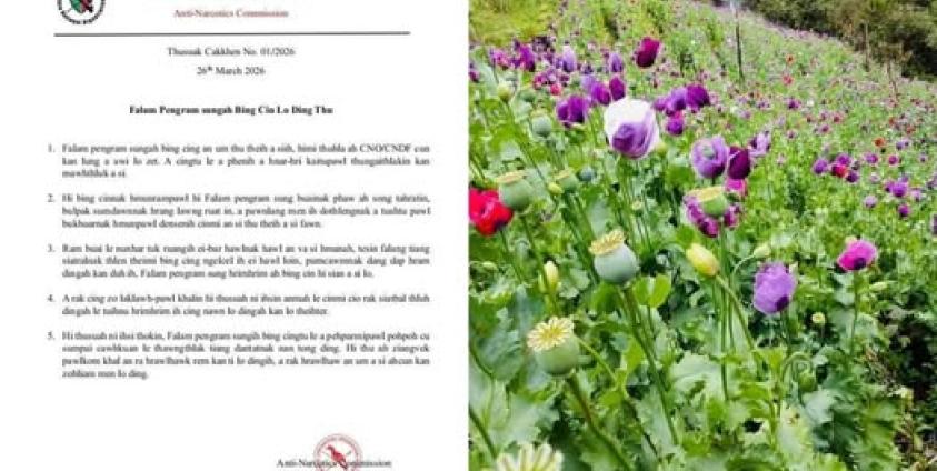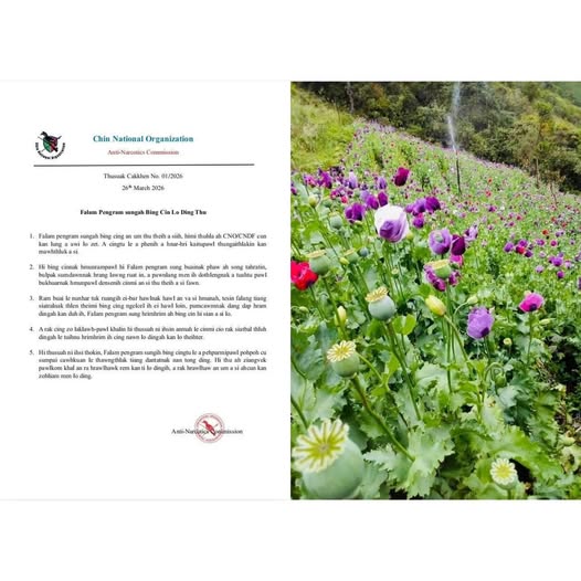 The Chin National Organisation (CNO), the political wing of the Chin National Defence Force (CNDF), announced on March 26 that it strongly opposes opium poppy cultivation in Falam Township, Chin State, declaring a ban on such activities and warning of strict penalties, including imprisonment and fines, for non-compliance.