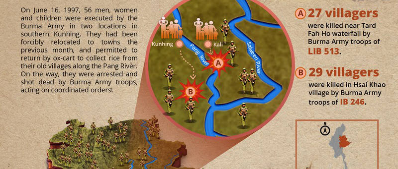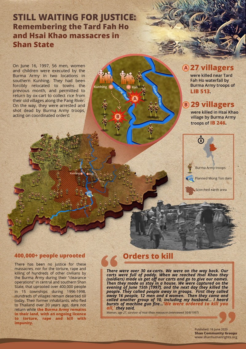 “On June 16, 1997, 56 men, women and children were executed by the Burma Army in two locations in southern Kunhing. They had been forcibly relocated to the town the previous month, and permitted to return by ox-cart to collect rice from their old villages along the Pang River. On the way, they were arrested and shot dead by Burma Army troops, acting on coordinated orders: 29 villagers were killed by troops of IB 246 at Hsai Khao, and 27 were killed near Tard Fah Ho waterfall by troops of LIB 513. The bodies were just left in the open to rot,” writes the statement of 17 Shan community groups to mark the 23rd commemoration.