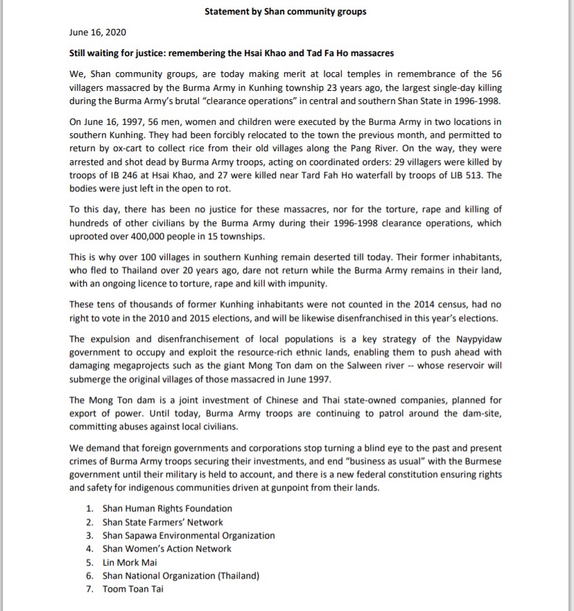 “On 16 June 1997, 56 men and women were murdered in southern Shan State Kunhing Township. They were burned together with their buffaloes, cows and properties, which were tragedies that will remain a historical black mark,” the statement added.