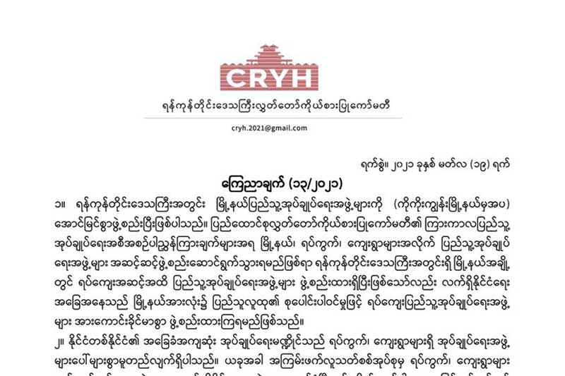 CRPH’s Yangon Region counterpart announces formation of township-level admin teams