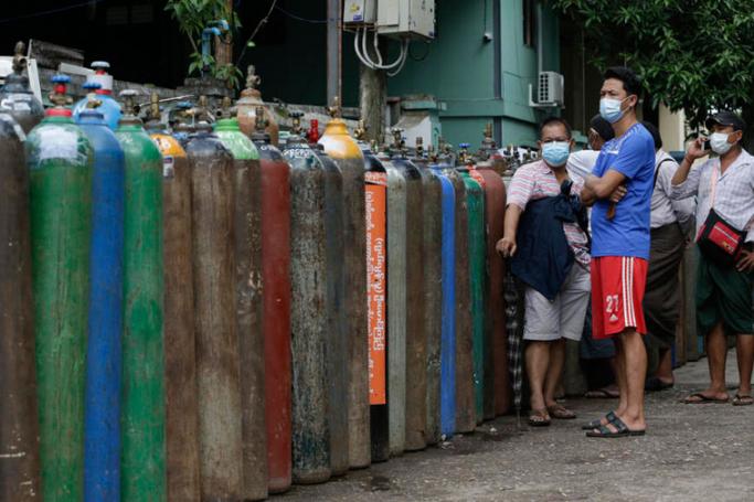 Hundreds queued across Yangon as the sun rose Wednesday in the hope of refilling blue oxygen cylinders to take home to family members stricken with the virus.
