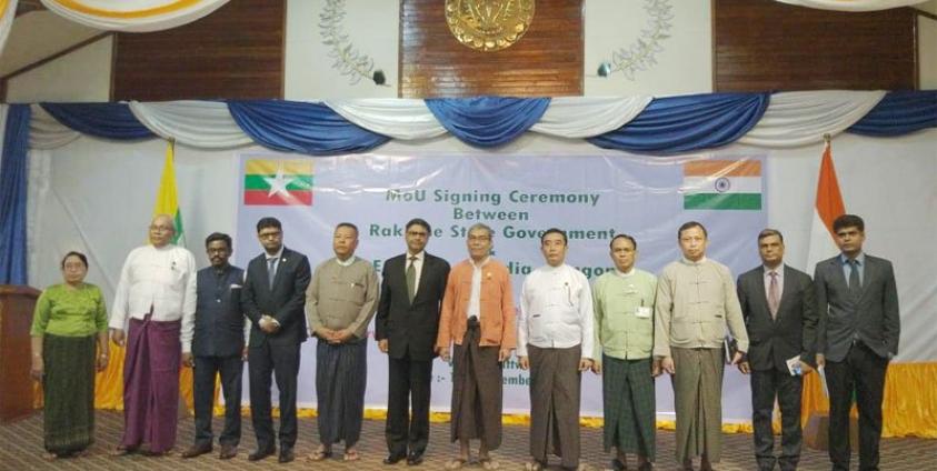 The MoUs were signed by U Kyaw Lwin, Hon'ble Minister for Agriculture, Livestock, Forestry and Minerals (Rakhine State Government) and Dr. Chan Thar, Hon'ble Minister for Department of Social Affairs, on behalf of their respective Ministries and H.E. Shri Vikram Misri, Ambassador of India to Myanmar on behalf of Embassy of India, Yangon, in the august presence of Hon'ble Chief Minister of Rakhine State, U Nyi Pu. Cabinet Ministers from Rakhine State Government, Principal and Teachers from Sittwe Computer University, Peasant Union members and prominent civil society members from Rakhine State were also present on the occasion.